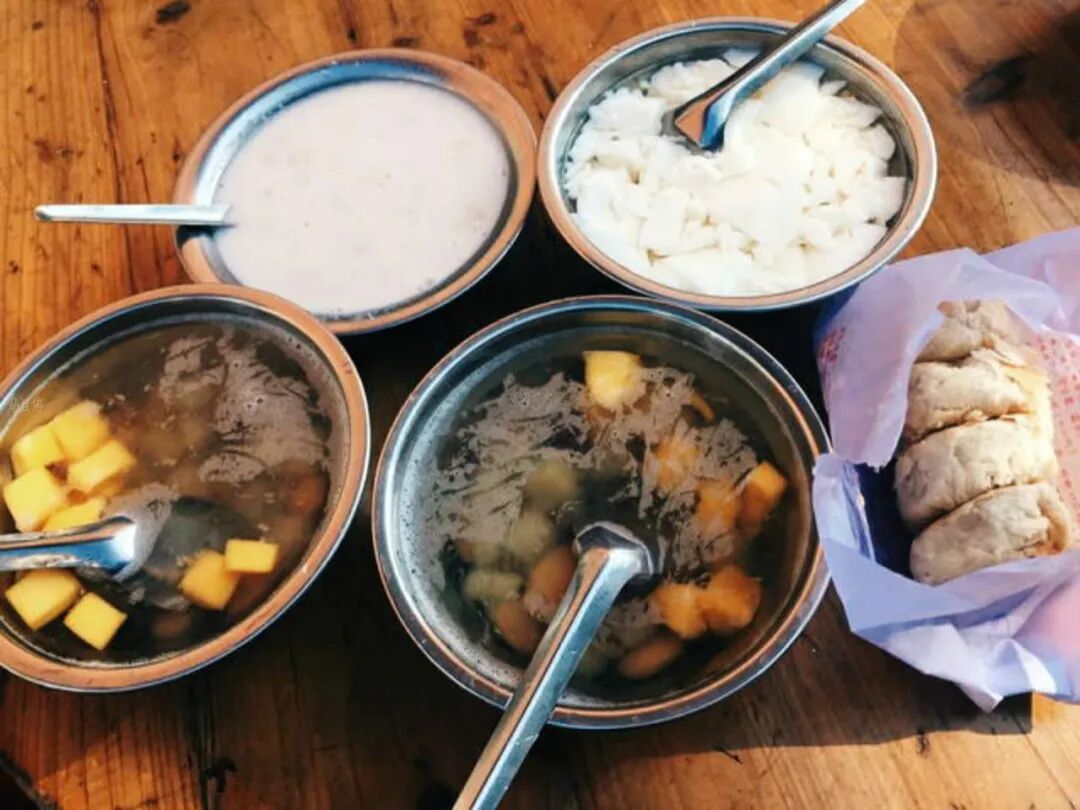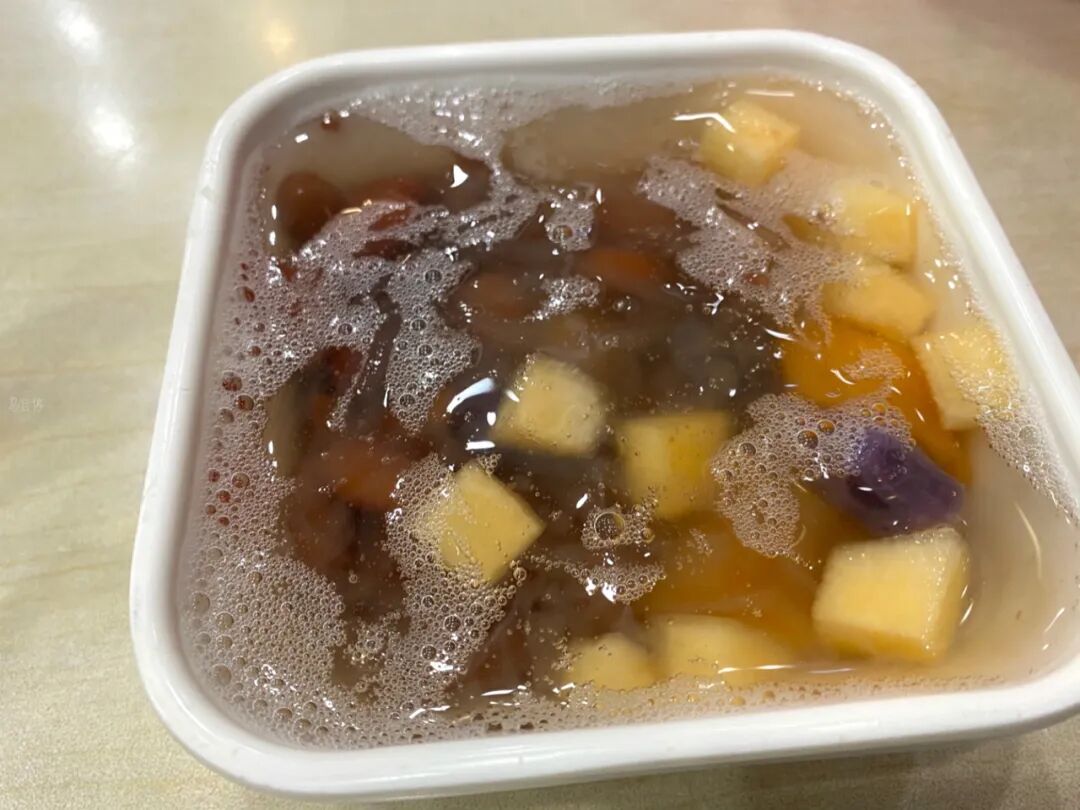 顾名思义,四果汤就是可以从繁多的食材中挑选四种食物,繁多的食材包括绿豆,花生,芋圆,芋头,红薯以及各种水果等,我个人比较喜欢芋圆,芸豆和芋头,搭配上特色的石花膏,那么一碗四果汤就出炉,口感清淡甘甜,既不会像甜品那样腻,也不会太淡,属于恰到好处的甜度。