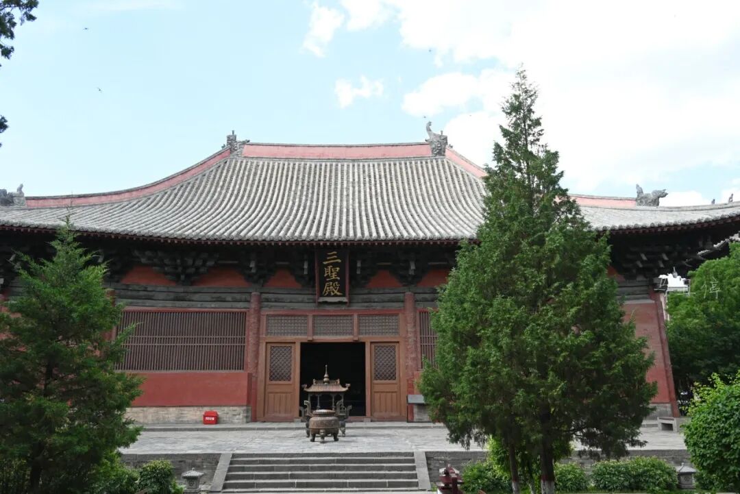 三圣殿为一座面阔五间,进深四间,单檐庑殿顶的建筑,殿堂内部采用了减柱法,因为大雄宝殿和普贤阁的存在,因此三圣殿看起来就逊色一些。不过殿堂内的华严三圣为金代的原作,立于殿内两侧的石碑,均为金代修缮善化寺的题记。其中金大定十六年为南宋使金通问副使朱弁所撰的《大金西京大普恩寺重修大殿记》,价值很高。