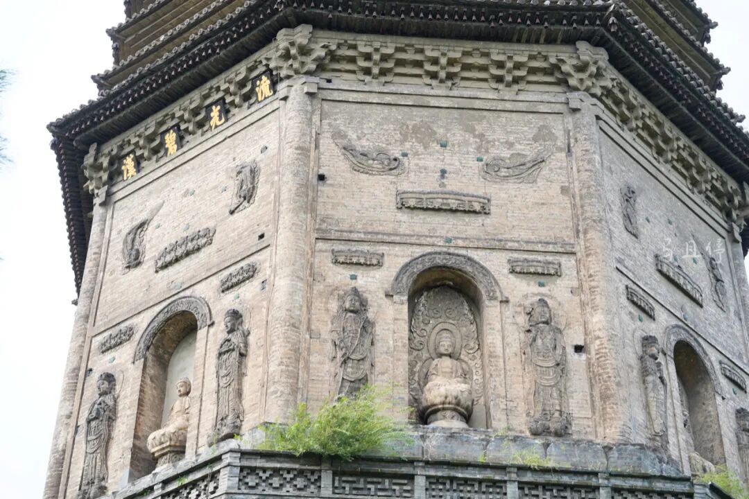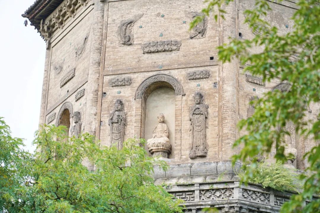 仔细观看的话,你可以在塔身上看到辽代及其特色的麦叶纹,而那一尊尊精美的菩萨浮雕或许诠释了汉民族与佛教文化相互融合的产物。在菩萨浮雕的上方还可以看到极具异域气息的飞天造像,可谓是栩栩如生,成为辽代建筑中的精品。