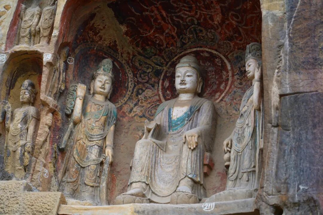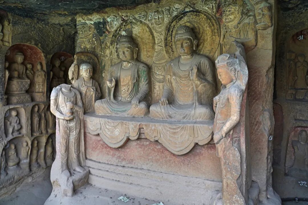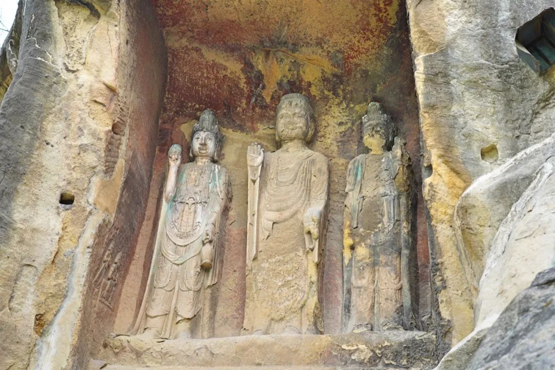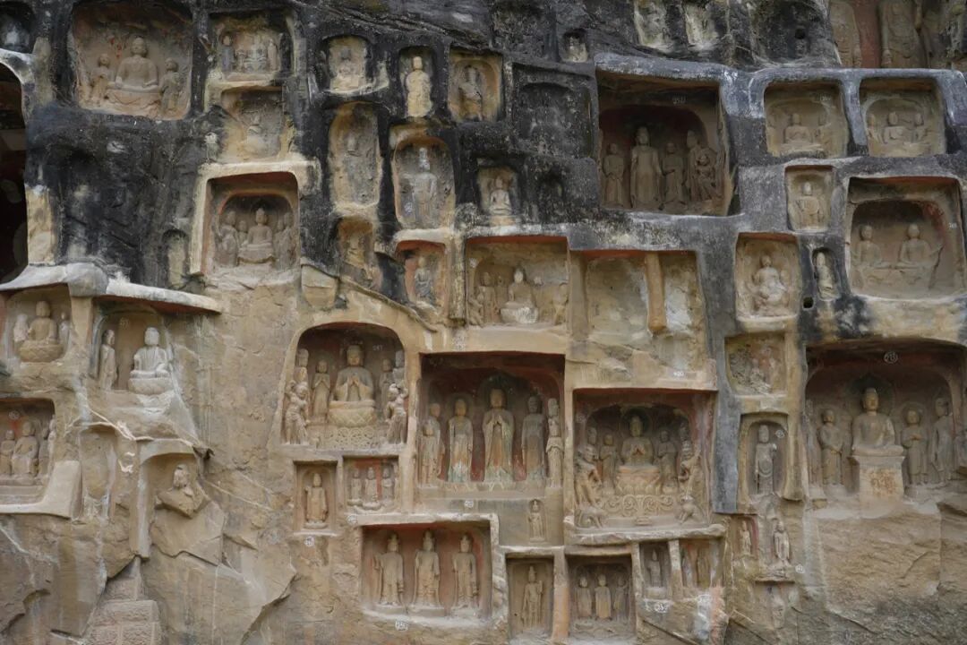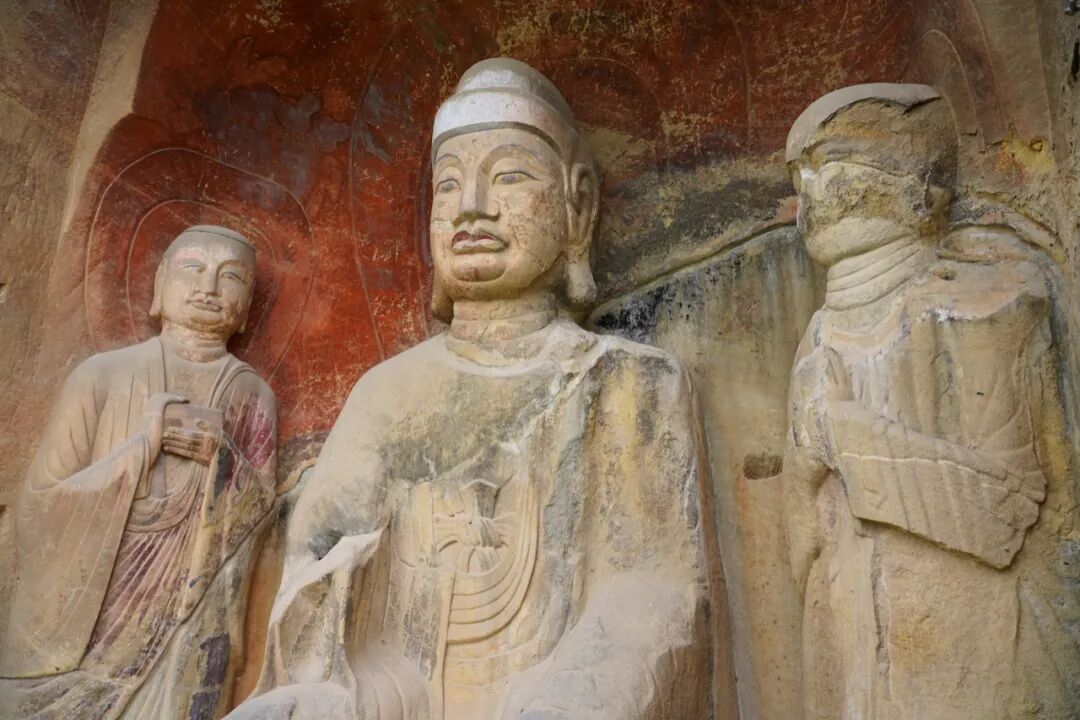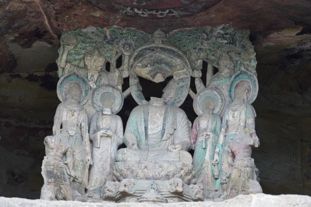 和“多宝窟”一样精美的还有北侧底部始凿于公元723年的苏颋龛,窟龛规模不大,仅1.8米高。但是其中的一佛二菩萨三尊像比起其它窟龛来说可谓是精美很多,面相方圆适中,嘴角微陷,在颈部还可以看到三道纹。