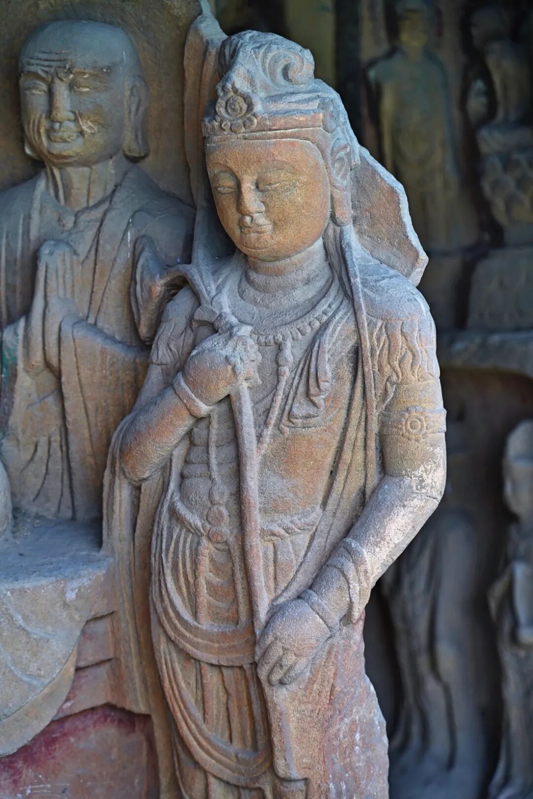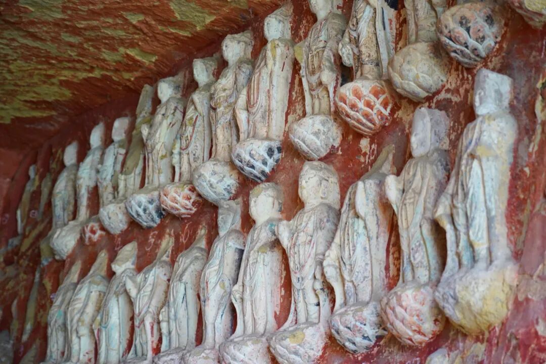 当然还可以重点关注一下两侧的崖壁,上面雕刻着约150尊观音菩萨雕塑,脚踏云莲,头戴花冠,身披华服,看起来极其的壮观。