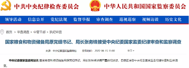 6月15日,中央纪委国家监委公布,国家粮食和物资储备局原党组书记、局长张务锋涉嫌严重违纪违法,目前正接受中央纪委国家监委纪律审查和监察调查。