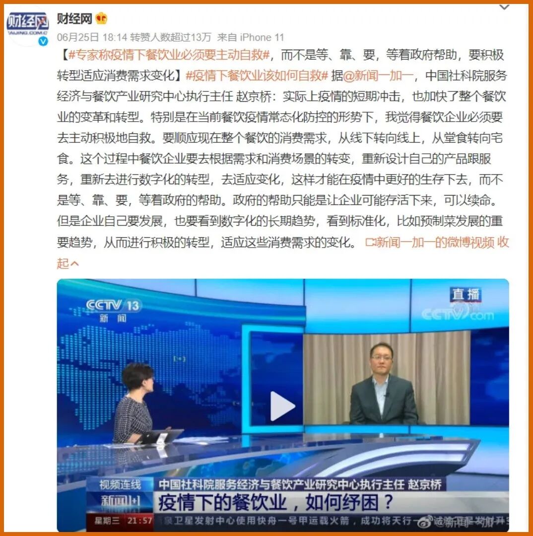 赵专家还说,必须从线下转向线上,从堂食转向宅食,重新设计自己的产品和服务,重新去进行数字化的转型。