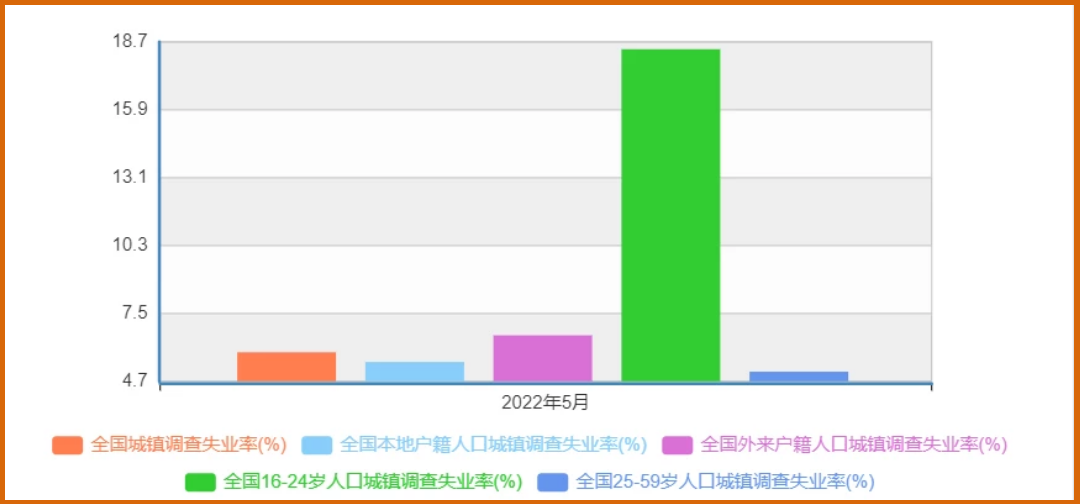 国家统计局的数据,5月份全国城镇调查失业率5.9%,16-24岁人口,也就是青年失业率达到了18.4%,创新高。