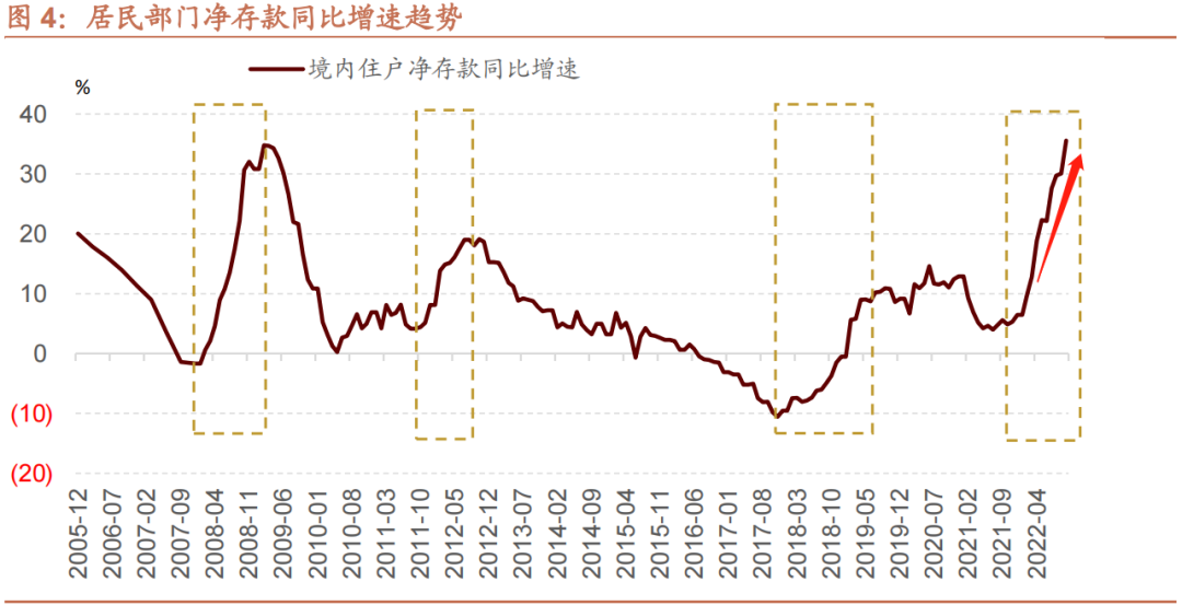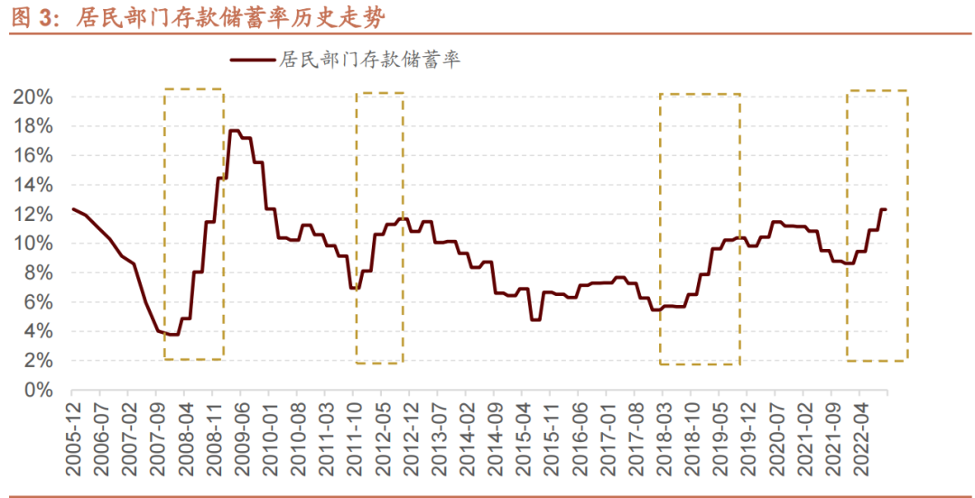 当经济好转、企业盈利增速上行,居民储蓄率下降;而经济和企业盈利增速下行到一定阶段,引发居民防御性储蓄增加。