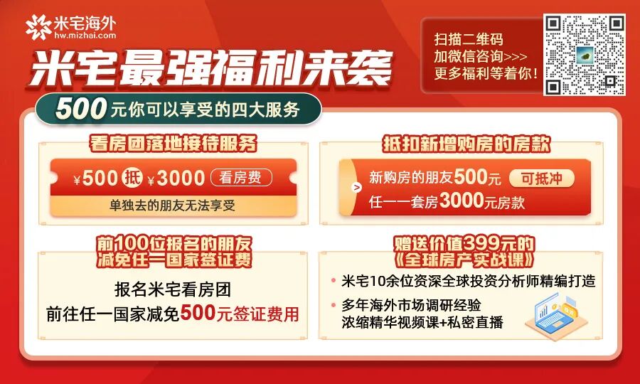 3.前100位报名的朋友,跟随米宅看房团,前往任一国家免500签证费;