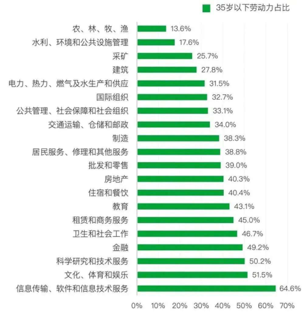 第七次人口普查数据显示,信息传输、软件和信息技术服务业,文化、体育和娱乐业,科学研究和技术服务业,金融业这四大类行业的35岁以下就业人口占比位居前四,而这些基本也是收入在金字塔顶端的一些主力产业。