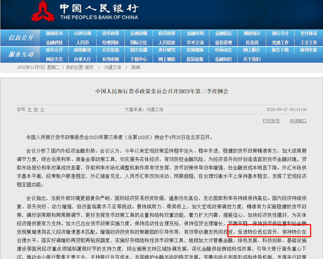 此时,我想到一件事,那就是9月召开的央行货币政策例会,里面有谈到一句“促进物价低位回升,保持物价合理水平”。