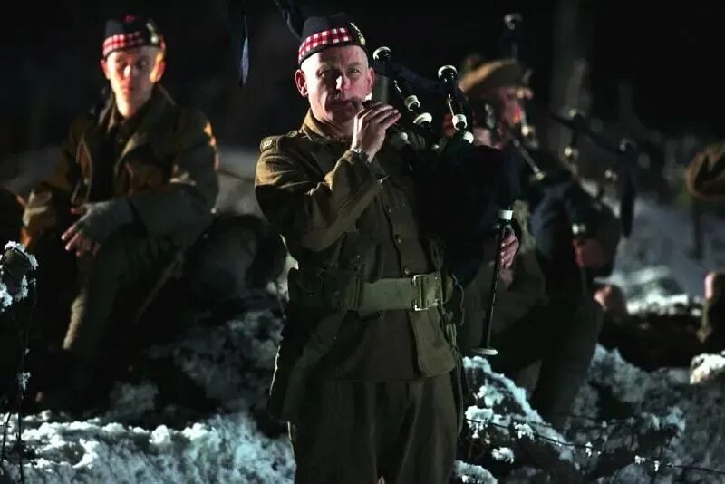 歌声打破了这种敌对的状态,而英军的士兵们在听到歌声之后也慢慢从战壕里站了起来,不仅如此,有风笛手竟然吹奏起来给歌手伴奏。
