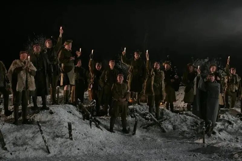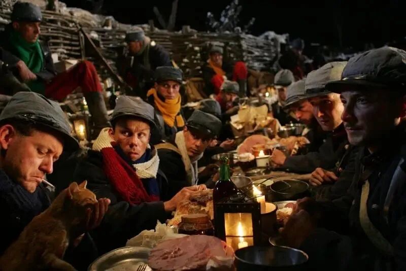 平安夜里,双方都无心打仗,不管条件多么艰苦,总归有个仪式感,于是德军在战壕里摆放了象征意义的圣诞树,大家聚在一起喝起了酒唱起了歌。