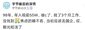 今天的主角在字节,收入比较高,但被裁了,焦虑的睡不着,空窗了几个月,后悔当初没去国企。