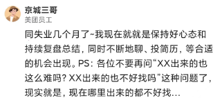 失业是不可怕的,因为大家都差不多,你这样,别人也好不到哪去,但谁找工作快,跟身边一起离开的同事交流下,或许能启发自己。求职的周期加长,不是人为的因素,而是市场因素。
