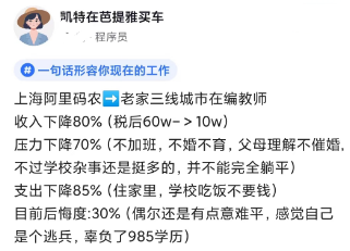 今天要说的是一位阿里码农,放弃了税后60万的工作,选择了在编的老师,看看他的真实现状,看下是不是你向往的工作。