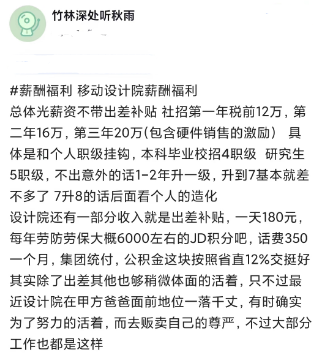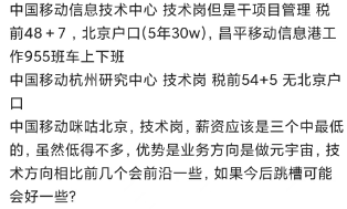 看完移动的一些岗位薪酬,感觉高还是低,研发岗待遇相对有优势。别总跟互联网大厂对比,跟央企和国企对比更合适,你准备混哪个系统,就去研究那个生态,而不是总和不同类型的公司对比,痛苦都是自找的。