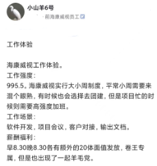 通过一些在职和离职的同行在海康的体验经历,相信对海康有一个基本印象了,大公司都加班,海康也不例外,其他的其实跟其他公司区别不大。别人的感受是别人的,如果觉得有想去去海康,可以去体验下,职场新人不适合随时可以换。海康有自己的优势,也许你进去了觉得里面没啥,人的价码是市场给的,出来在市场露脸就知道意味着什么。