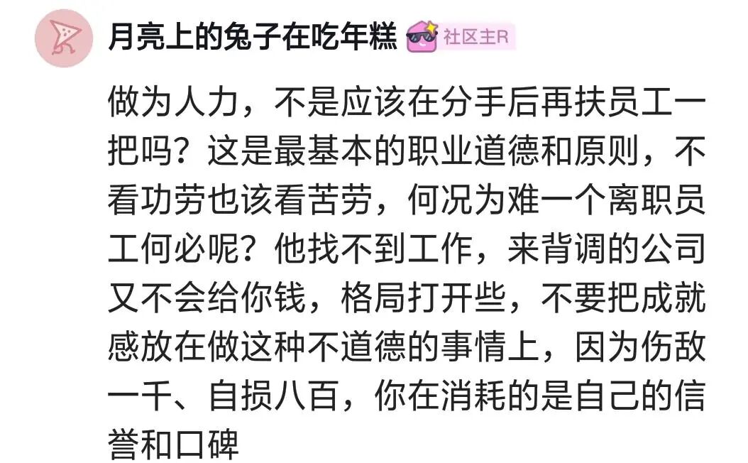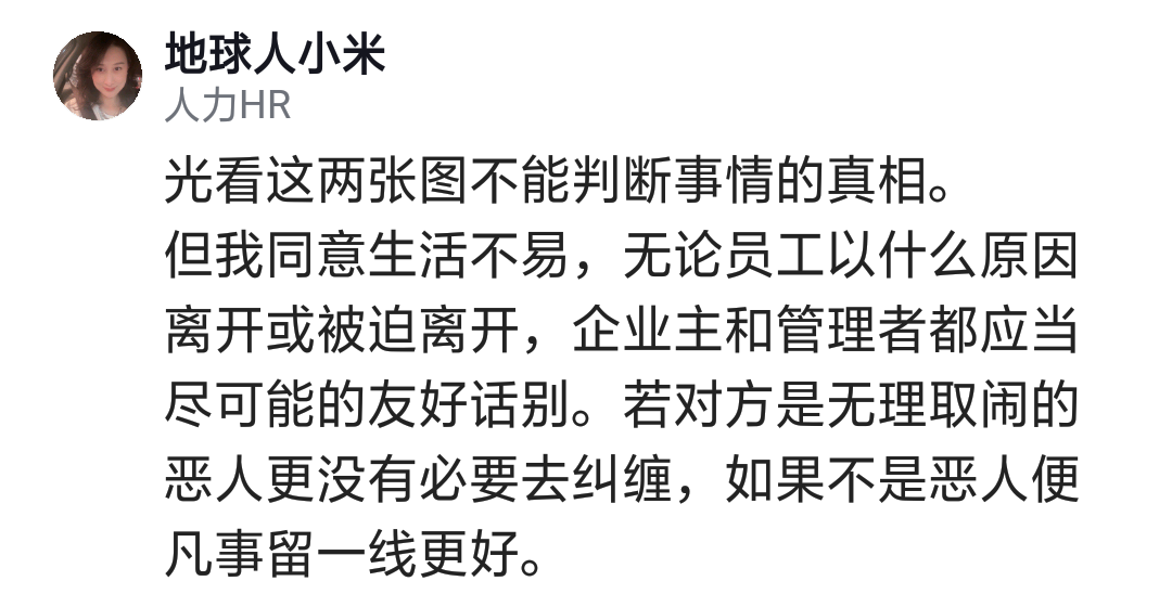 非常同意这位HR的观点,无论员工以什么原因离开或被迫离开,企业应该善待员工,好聚好散,不同的人,不同的对待方式。HR跟HR是不同的,在什么公司遇到什么人了,就决定在职场上会遭遇什么问题。