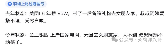 有个美团L8级别的员工爆料,说自己的年薪95万,去女朋友家买了一堆的礼物,最后还是受尽白眼,看到这个你的感受是什么?如果是你,你会怎么办?后面自己上岸了国家电网,女方父母态度大转弯,人不到,不动筷子,形成鲜明的对比。