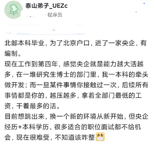 对于央企,去了才知道会遇到什么问题,楼主是为了户口,越能干,干得越多,看你在央企遇到了什么?想离开也没错,就在央企圈子找,有合适的就过去,没合适的就暂时待着。