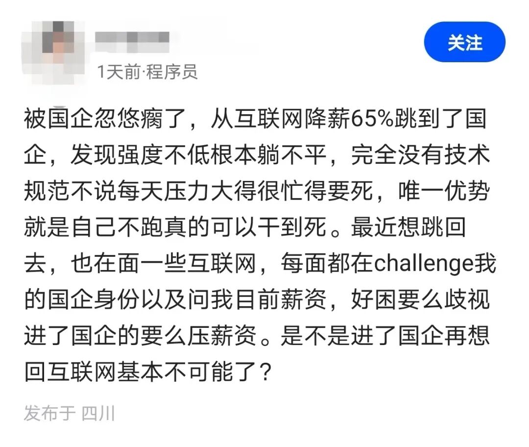 一个27岁的哥们,为了彻底躺平,从互联网降薪65%跳到了国企,但却后悔了。