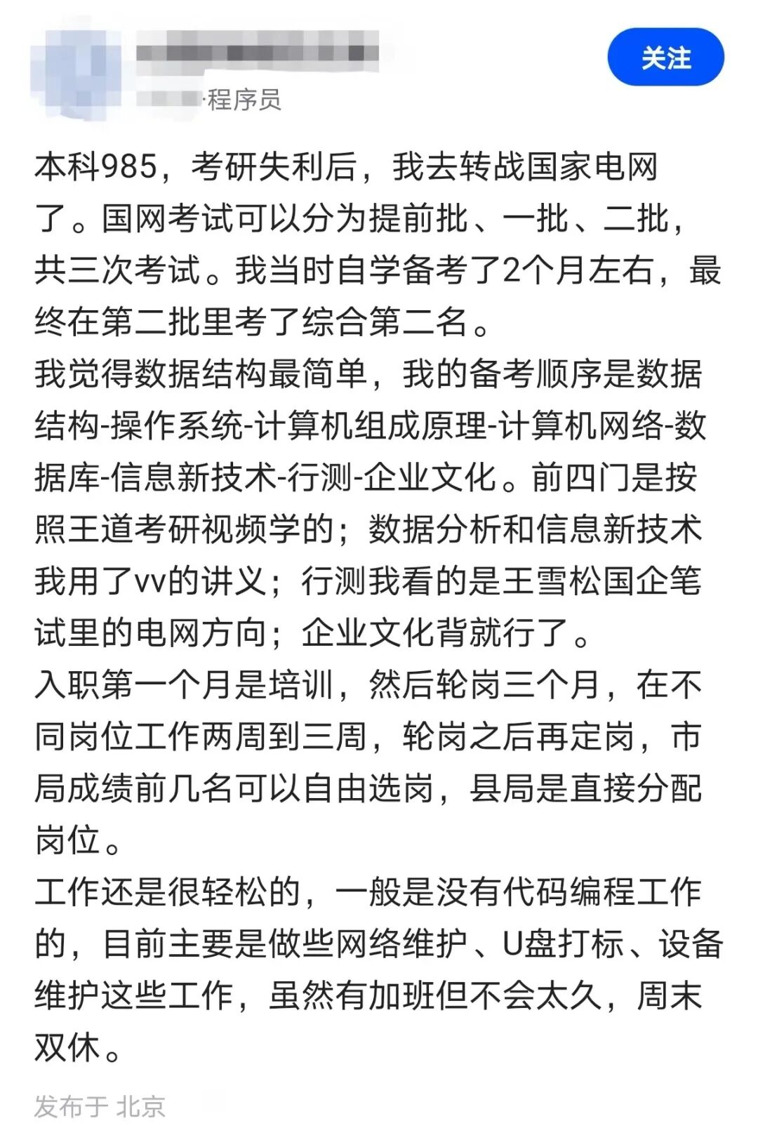 “本科985,考研失利后,我去转战国家电网了。国网考试可以分为提前批、一批、二批,共三次考试。我当时自学备考了2个月左右,最终在第二批里考了综合第二名......工作还是很轻松的......”