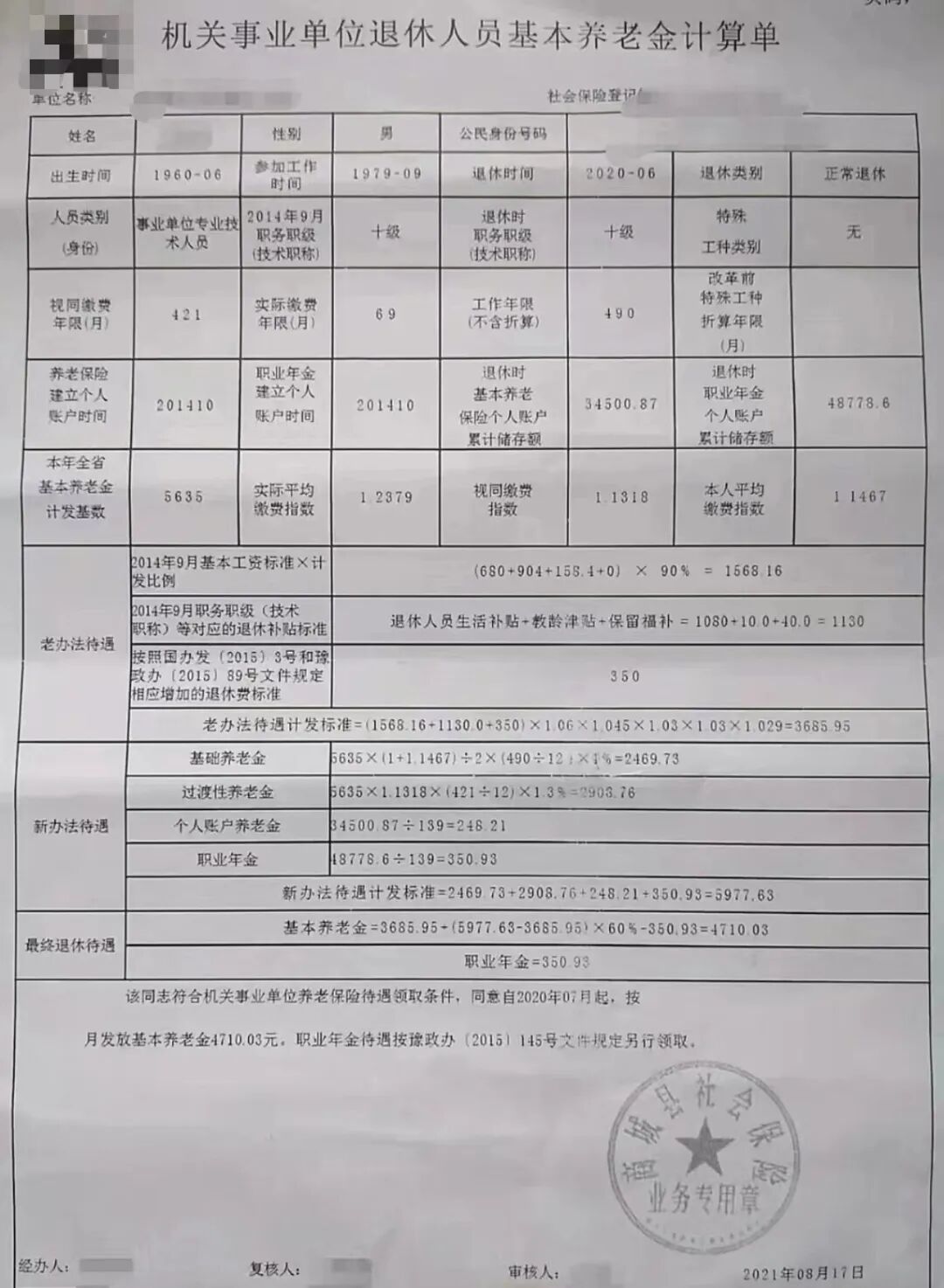 最终的退休待遇是:月基本养老金4710.03+职业年金350.93=5060.96元。