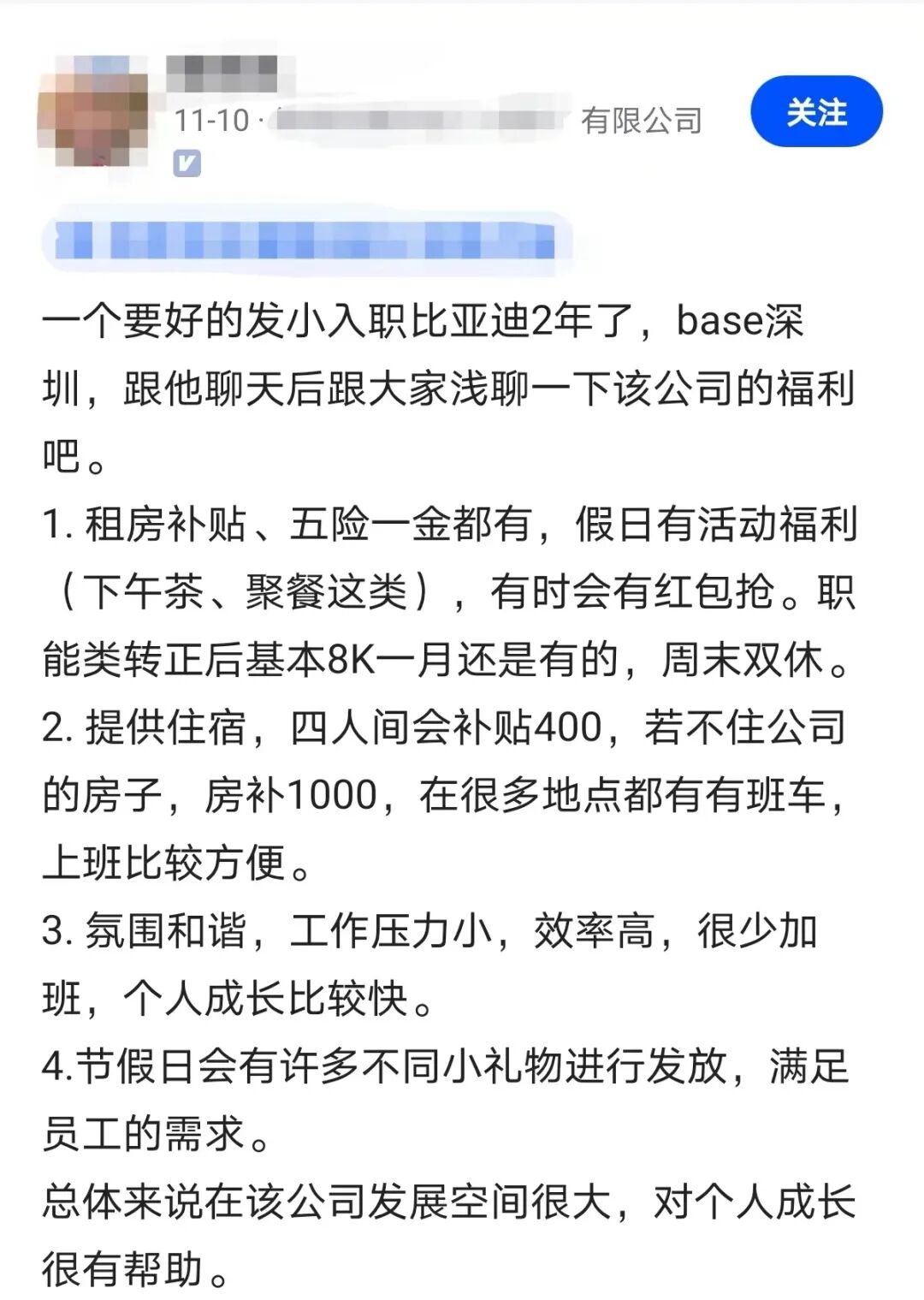 “一个要好的发小入职比亚迪2年了,base 深圳,跟他聊天后跟大家浅聊一下该公司的福利吧。