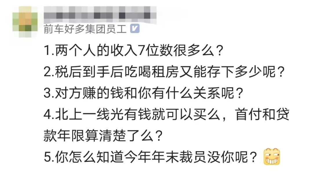 还有网友发出了一连串的灵魂拷问:两个人的收入7位数很多么?税后到手后吃喝租房又能存下多少呢?对方赚的钱和你有什么关系呢?北上一线有钱就可以买么,首付和贷款年限算清楚了么?你怎么知道今年年末裁员没你呢?