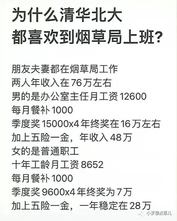 更有网友爆料,烟草局中有夫妻档员工的例子,他们的薪资和福利待遇更是让人咋舌。