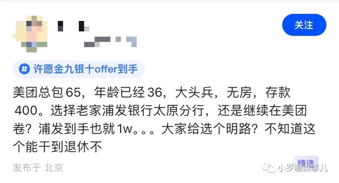 也有网友建议选择老家浦发银行太原分行。毕竟随着年龄的增长,他在美团的工作压力只会增不会减。太原的浦发银行提供的月薪虽然只有1万元,但寻求一种更加稳定和轻松的工作生活方式,对他来说,似乎是一个不错的选择。