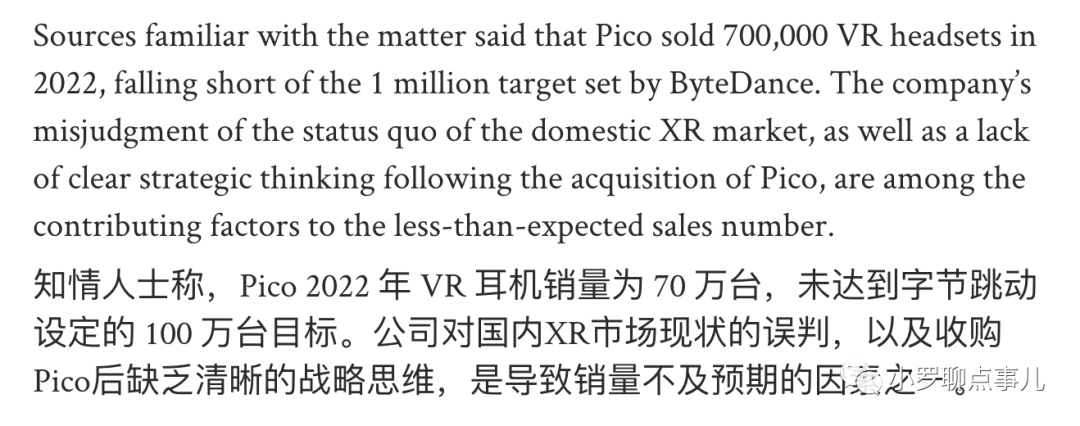 业务表现未达预期:PICO 在 2022 年的销售量未能达到设定的 100 万台目标,只卖出了 70 万台,表明其产品在市场上的表现未达公司预期。