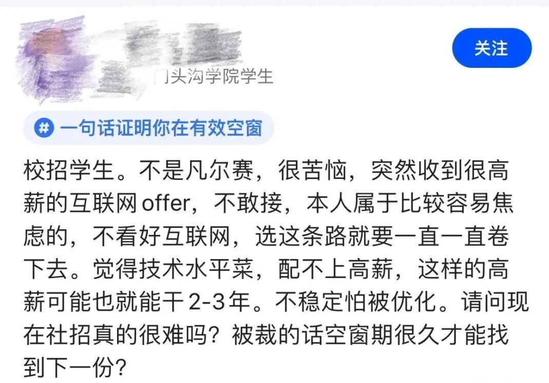 让我们看看这位网友的故事,校招期间拿到大厂 offer,年薪高达 60w+,但是自身处于焦虑状态,害怕入职后领导发现是个水货,被裁员。