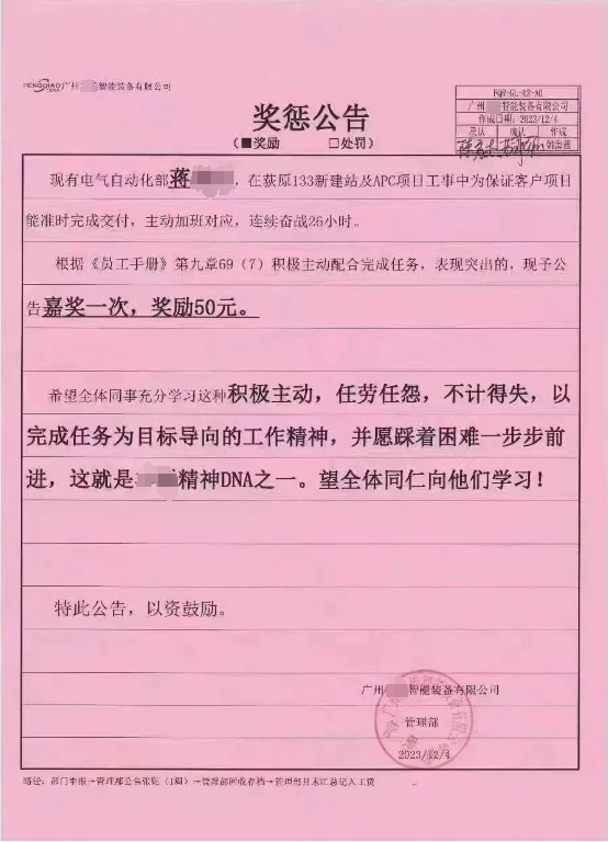 先是,广州某司发布了一则“奖惩公告”,说的是工程师蒋某在项目中连续奋战26小时,表现特别突出,故决定授予其特别嘉奖,以资鼓励,奖励金额为:
