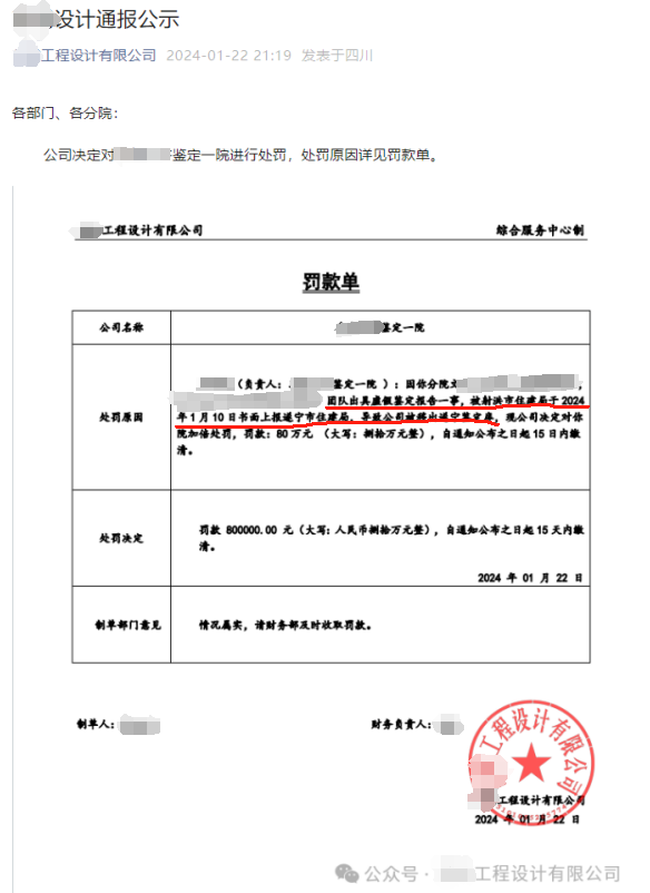某设计大院的某分院,因为出具虚假鉴定报告,被某地住建局“清理出库”,随后,公司发布公告,决定对该分院罚款80万元。