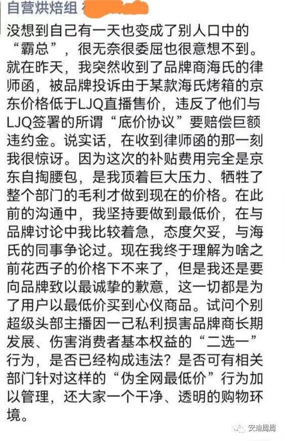 李佳琦最近过得不太平,越来越像被群殴的样子了,从说花西子眉笔69元你觉得太贵,努力工作有没有涨工资被群嘲,到这两天双11活动,直播间卖电烤箱比京东贵一倍,打起了官司。很多人都义愤填膺,觉得这回李佳琦肯定干不过京东,还可能违反垄断法,要被罚款21亿,等着看他穷困潦倒,再次回到商场柜台,当“柜姐“努力卖货的惨样子。对不起,你永远看不到这一幕的出现了,你的意淫注定无效。这些买不起69块眉笔,看热闹不嫌事大的人,觉得李佳琦坑了老百姓。电烤箱你卖600块,京东不到300,你这不是坑消费者么?