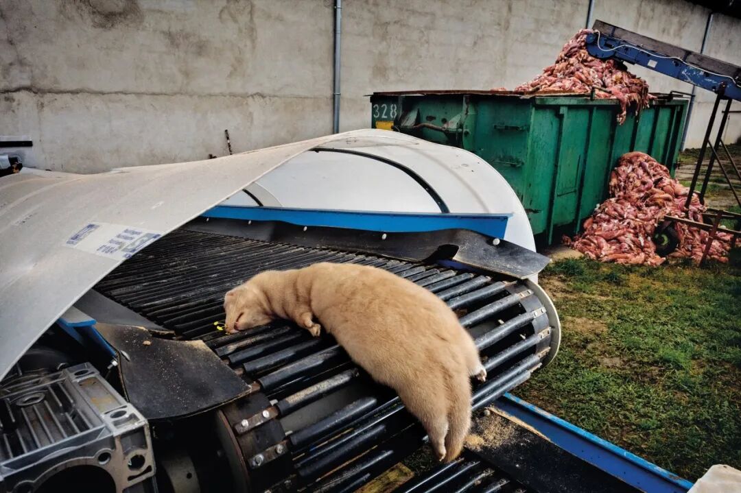 传送带的另一端正在将剥皮后的水貂尸体输送至垃圾箱,这些尸体除了制成肥料,没有其他的用处。这样的一个养殖场每天可以处理数千只水貂。