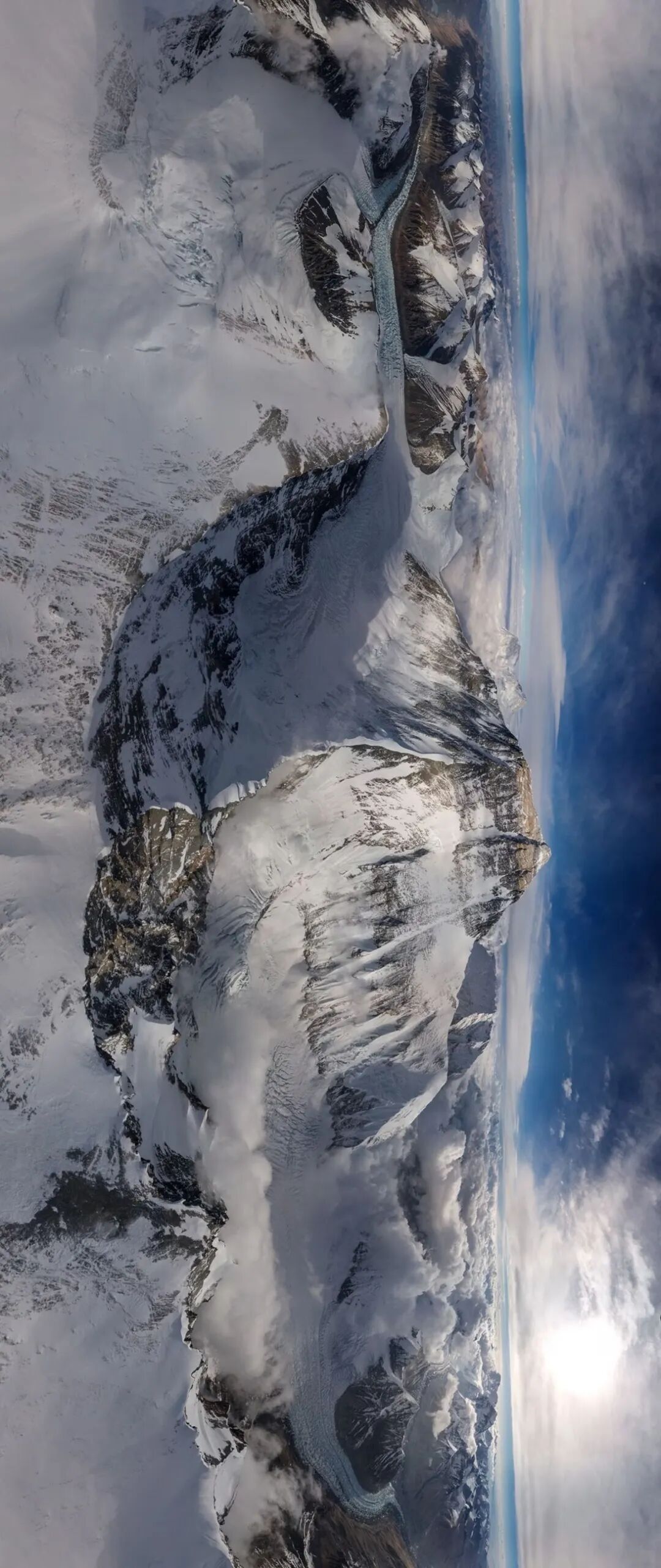 于是,在2019年,39岁的专业登山家兼电影制片人雷南·奥兹图克(Renan Ozturk)受邀为国家地理杂志拍摄了这张照片,他使用了一架经过特殊改装的无人机拍摄360度全景图。既展现了珠穆朗玛峰的壮丽景色,又揭示了其在高原群山之中制高点的位置关系。