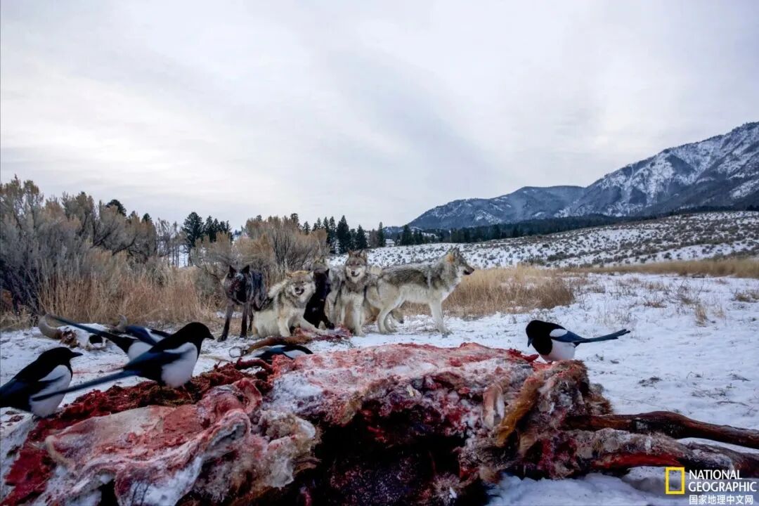 在怀俄明州(Wyoming)的黄石国家公园(Yellowstone National Park),迈克尔·尼科尔斯(Michael Nichols)拍摄到了一群狼在存放尸体的垃圾场附近觅食的照片,这一现象与黄石公园的生态历史密切相关。