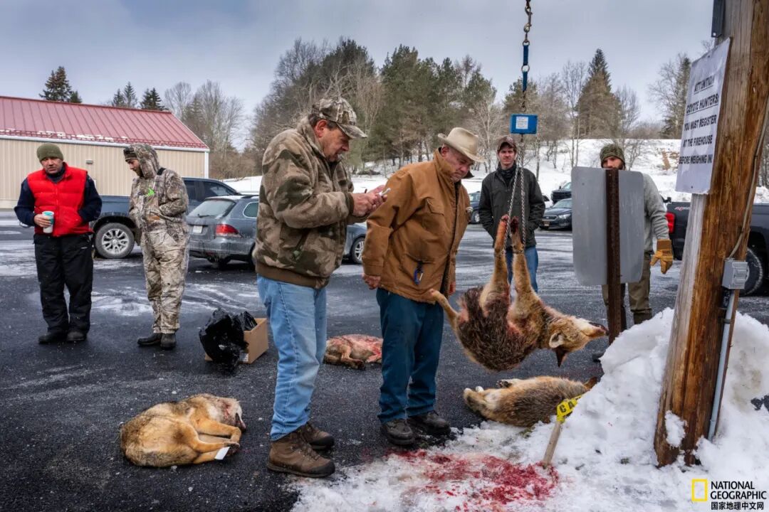 图片中被吊起来的狼,是卡琳·艾格纳(Karine Aigner)在硫磺泉消防站(Sulphur Springs Firehouse)拍摄的某次狩猎比赛中的猎物。