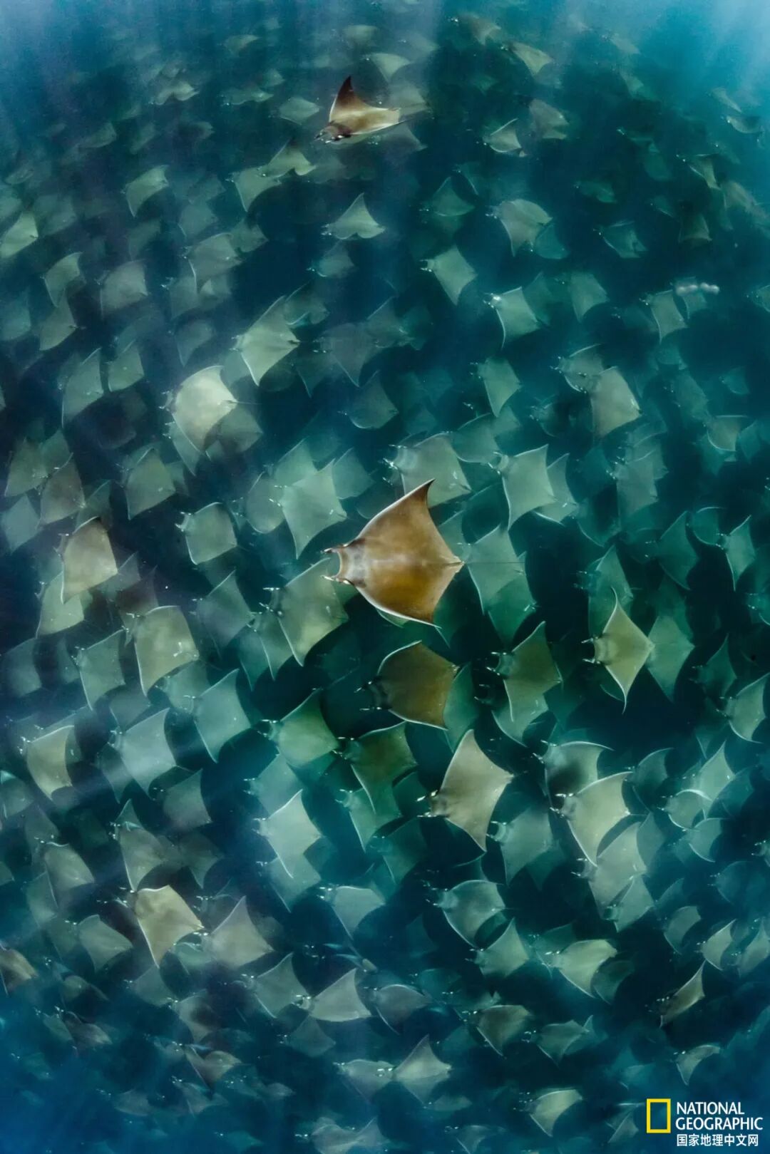 摄影师肖恩·海因里希斯(Shawn Heinrichs)在墨西哥科特斯海(Cortez)的海浪下,拍下了数百条芒基蝠鲼(Mobula munkiana)卷起如龙卷风般的“求偶旋涡”,这一壮观场面持续了整整5个小时。