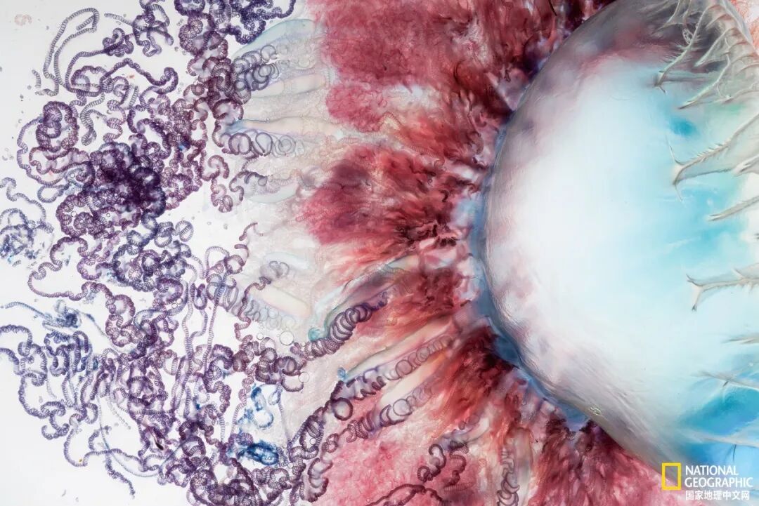 图片中颜色极为丰富的右侧是僧帽水母的椭圆形漂浮体,这是它能够漂浮在海中的关键。