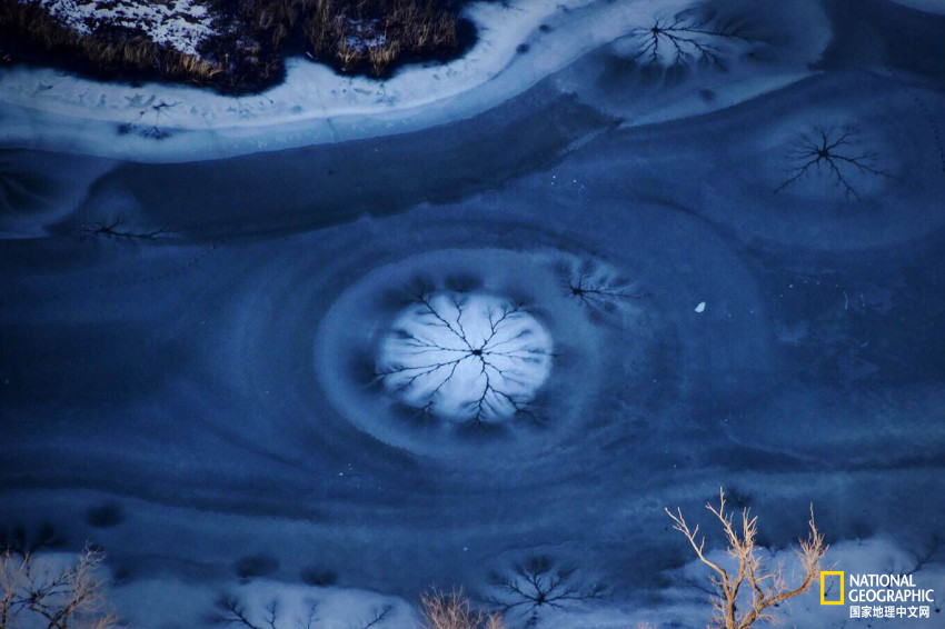 这张普拉特河(Platte River),是摄影师迈克尔·福斯伯格(Michael Forsberg)从240米高空航拍的,水从地下喷涌而出,打在已经冰冻的河面上,形成了像雪花一样的图案。