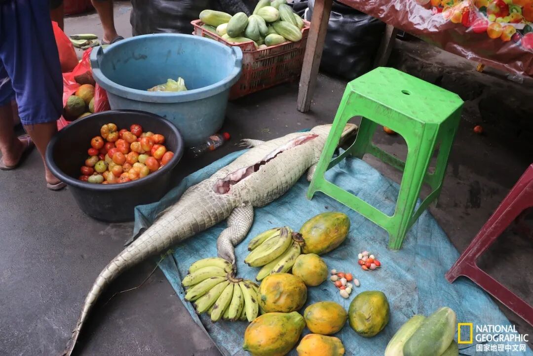 在这个繁忙的街道上,能看到被挖掉内脏的凯门鳄在水果摊出售,摆卖的罐子里装着树懒的爪子,鸡胸肉旁边是血淋淋的黄脚龟肉。