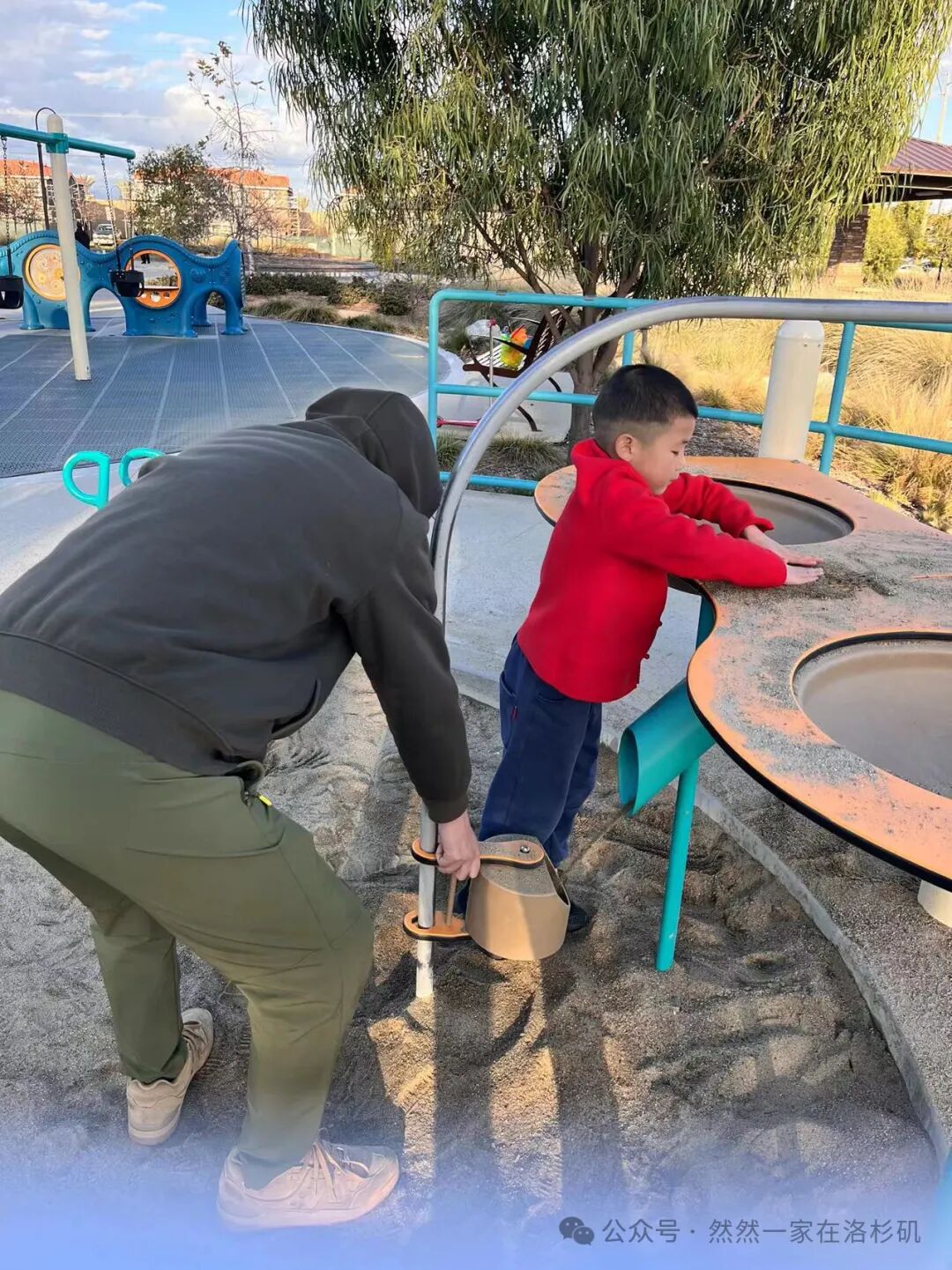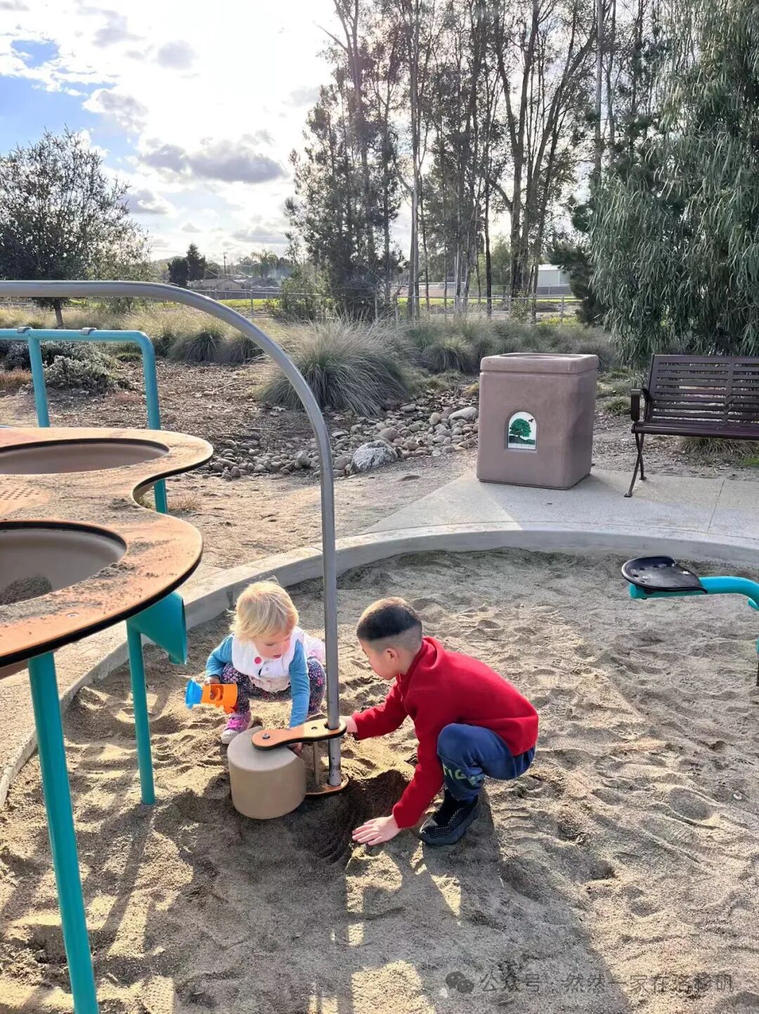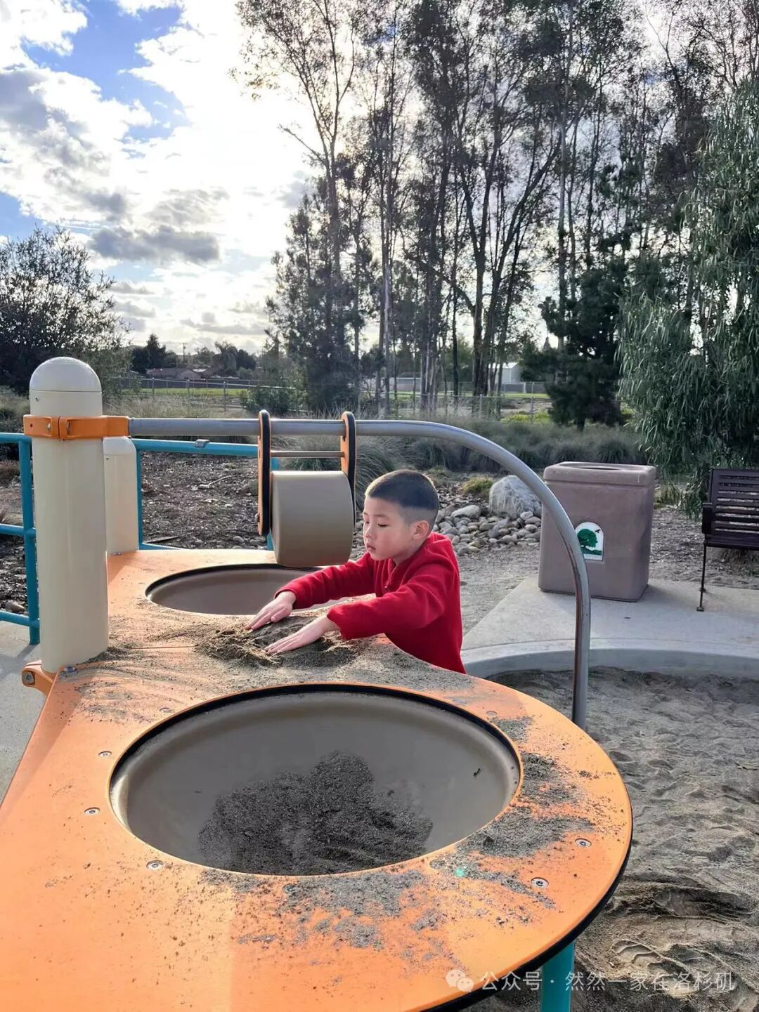 这是一个小学旁边的公园。有个超级大的草坪,还有滑滑梯、沙池、转转椅、兼顾各个年龄阶段的秋千和滑索。除了给小朋友准备的玩乐设施,这里还提供成年人用的健身器械,如推举装置和跑步装置。然然最喜欢沙池,可以用挖挖机挖,可以用提桶装,还可以倒到漏斗里。他激动的喊:“妈妈,快看,沙子从下面出来了!”过一会,又吩咐他爸帮他提着装沙桶接漏下来的沙粒。有个小洋娃娃也在沙坑玩,粉嘟嘟的抓一把沙,扬起一片。就这样,6岁的大男孩和2岁的小baby无语言交流,分工合作。