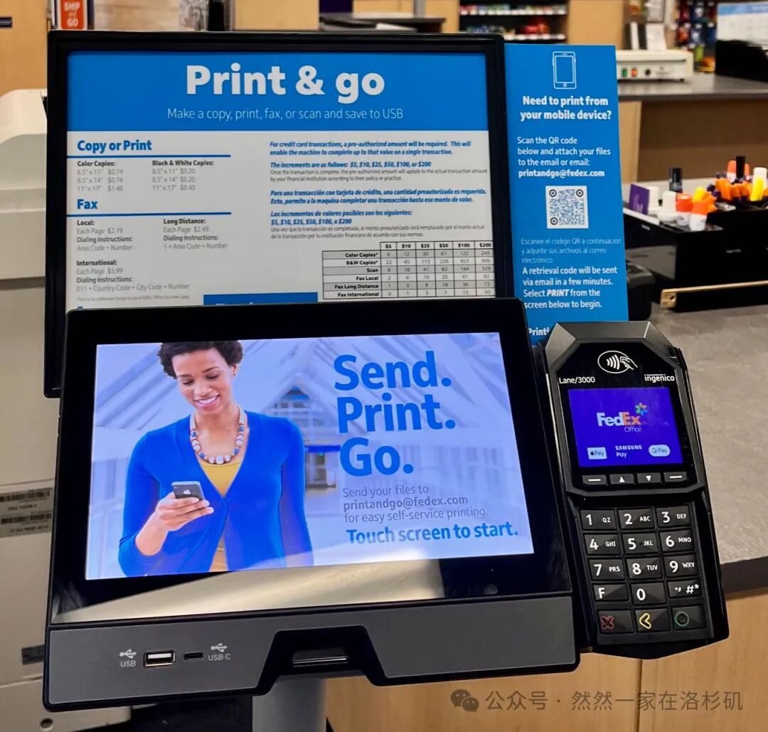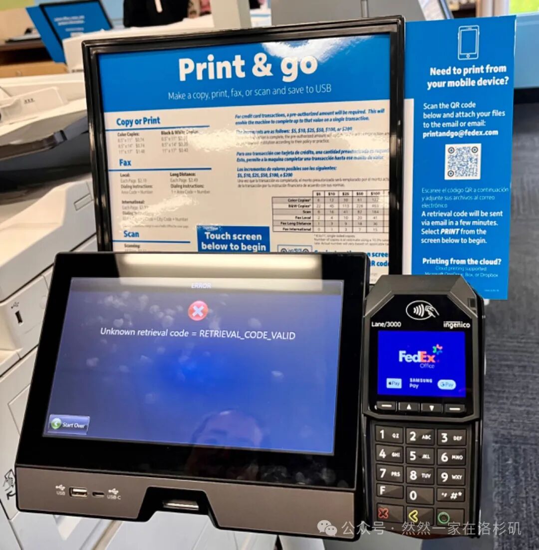 社死场景二:我要打印I94表。排队核验资料(护照、I94、2份居住证明),哦豁,忘记打印I94表了。翻出小红书,定位能打印的FedEx(FedEx除了能寄快递外,还有打印服务)。下载表格,查看打印攻略,扫描机器上的二维码发邮件,等待回信查收打印code,成功解锁第一步。随后点击屏幕,左侧菜单栏选“print”,然后选择支付方式(如果是信用卡需预缴费),最后输入邮件里的code打印。输入打印码后屏幕上出现大大的❌,找不到相关信息。我俩对视一眼,会不会是文件没粘贴对?重来一次,不行。那换个邮箱发吧,我又试了一次,还是不行。找工作人员,那神情比我们还懵逼。啊,换台机器再试。在我心态爆炸之前,终于来了一个正式员工,把我们叫到服务台,拿到code,刷刷两秒钟打印出来。这感人的工作效率。