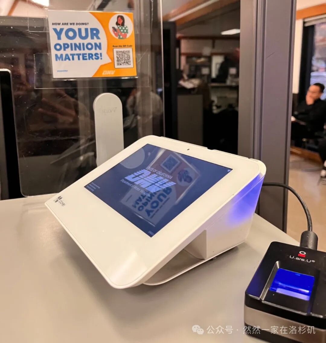社死场景三:我到底应该排哪里?时间已经指到下午一点,我们又回到DMV。拿号,在机器上注册,填写姓名、电话(需要接收验证码核实身份)、出身年月、护照号、居住地址,随后选择是否捐赠器官,是否捐款,是否是公民,一切填写完毕后获得一个预约码。拿到预约码后会获得一个现场排队号,等待叫号。随后到窗口再次核验资料,收费,打指纹。