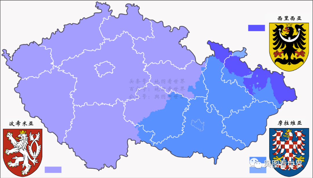 捷克人从历史发展的角度分为三个分支:波希米亚分支占人口总数的89%,摩拉维亚分支占人口总数的3.3%, 西里西亚分支占人口总数的0.1%。各分支生活的地区就演变为捷克的三个传统地区——波希米亚、摩拉维亚和西里西亚。波西米亚面积5.2万平方公里,占捷克总面积的66.0%;摩拉维亚面积2.2万平方公里,占捷克总面积的28.3%;西里西亚面积4459平方公里,占捷克总面积的5.7%。捷克国徽也形象地揭示了其历史的渊源:左上和右下的双尾狮代表波希米亚,右上格子花纹的鹰代表摩拉维亚,左下的黑鹰代表西里西亚。