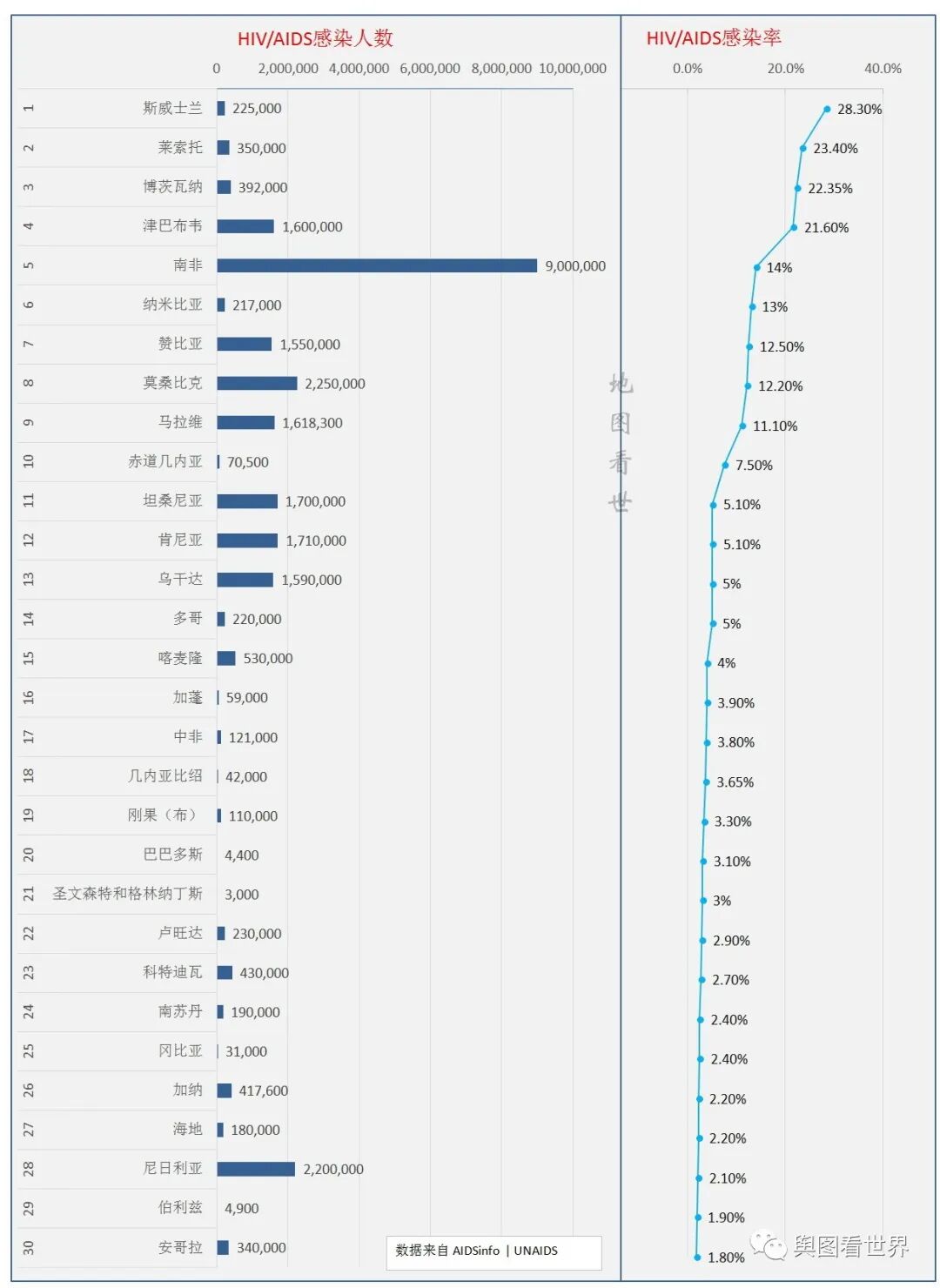 艾滋病是人类最大的杀手,大多数艾滋病患者都在非洲。截至2022年底,有3900万名艾滋病毒感染者,其中三分之二在非洲。在艾滋病感染率排名中,排在前十位的全部为非洲国家。斯威士兰感染率高达28.3%,是全球艾滋病感染率最高的国家。南非感染率为14%,感染率排名全球第5位;感染人数900万(2023年估计),是世界上感染艾滋病人数最多的国家。在曼德拉执政期间,艾滋病感染人数已经开始出现爆发式增长的苗头。姆贝基执政期间艾滋病大爆发,时任女卫生部长姆希曼说“多吃大蒜和甜菜根等可以增强人体免疫力,可以治疗艾滋病”,被人冠以“大蒜博士”。祖马曾经说“艾滋病没什么可怕,洗个热水澡就没事了”。