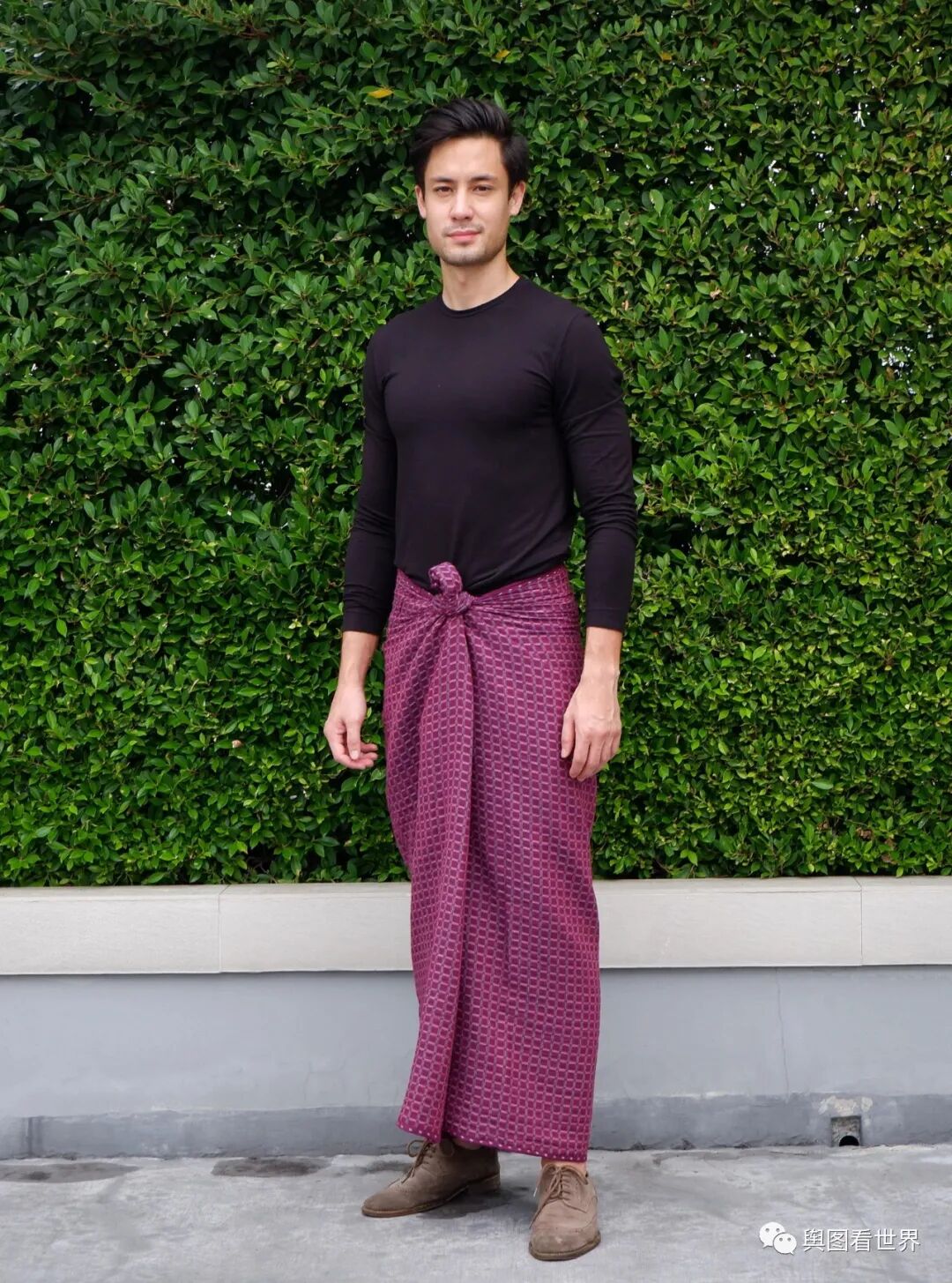 提起男人穿的裙子,大多数人首先会想到苏格兰格子裙。苏格兰格子裙学名为基尔特裙,是苏格兰民族的象征。实际上,男人穿裙子的国家约有十个左右,包括不丹、图瓦卢、斐济、缅甸等国家。在缅甸,不论男女下身都穿筒裙,统称“笼基”,男裙称“布梭”,女裙称“特敏”。“笼基”通常以长两米、色彩鲜艳且带有花纹的布料制造,将两头缝起成为圆筒形即可。男士一般会选格子或条纹,而女士则爱挑鲜粉红、明黄和蓝色底色,配以对比色图案或波纹。缅甸地处热带、亚热带,气候炎热,“笼基”不仅省布料,而且凉快。