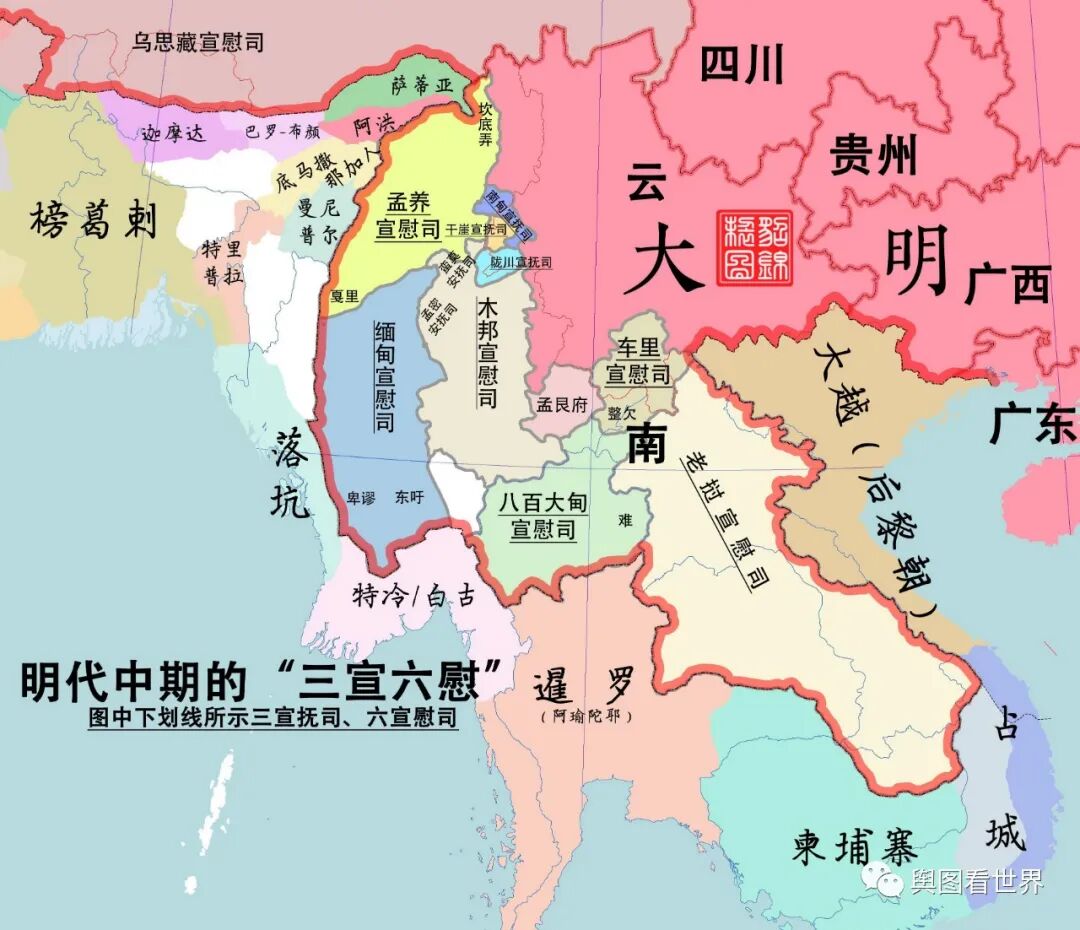 宋辽时期,缅北和缅东北部分地区属于大理国。元朝统一后,缅北、缅东北的大部分地区属于云南行省蒙庆宣慰司和大理金齿宣慰司管辖。明朝初期,由傣泰民族建立的“麓川政权”十分强势,明英宗花了八年的时间三次征讨麓川,最终征服“麓川王国”,并设立麓川平缅司,整个缅甸、老挝北部和泰国北部都成为明朝“名义上”的领土。为了统治西南领土,明朝在云南布政司下建立起一套内外分层管理的边疆政区体制,也就是著名的“三宣六慰”,三宣在滇西,六慰在缅北、缅中、泰国、老挝北部。明朝中期,缅甸东吁王朝崛起,逐渐兼并木邦、孟养等土司。明朝万历年间,东吁王朝的势力已经抵达今中缅边境附近。到明末,孟养(今缅甸克钦邦)、缅甸(今缅甸曼德勒地区)、木邦(今缅甸北掸邦)、八百大甸(今泰国清迈一带)、老挝(今老挝琅勃拉邦一带)都已经被缅甸实际控制。二战期间,英缅当局与中国划定“中缅1941年边界线”,奠定了今中缅边界线的走向。