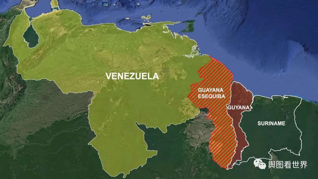 欧洲瓜分新大陆后,圭亚那高原被分割占领,成为西班牙、葡萄牙、荷兰、英国、法国等国殖民地。委内瑞拉独立战争期间,英国越过埃塞奎博河占领大片领土。1841年,英国决定以“尚伯克线”作为英属圭亚那与委内瑞拉的边界线。委内瑞拉对此表示反对,并申请国际仲裁。1899年10月,国际仲裁团将90%的争议地区划归英属圭亚那,将10%的争议领土(奥里诺科河口地区)划给委内瑞拉,委内瑞拉对此十分不满,但也无能为力。1966年,英属圭亚那获得独立,圭亚那继承了所有英属圭亚那领土。争议地区的附近海域发现了储量丰富的石油后,两国争端愈演愈烈。埃塞奎博河西岸地区面积15.9万平方公里,占圭亚那全国领土的62%,约为委内瑞拉现有领土的17%,与我国山东省一样大。